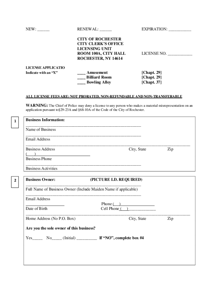 NEW: ___RENEWAL: ___ CITY OF ROCHESTER CITY CLERKS OFFICE LICENSING UNIT ROOM 100A, CITY HALL ROCHESTER, NY 14614LICENSE APPLICATIO Indicate with an X___ Amusement ___ Billiard Room ___ Bowling AlleyEXPIRATION: