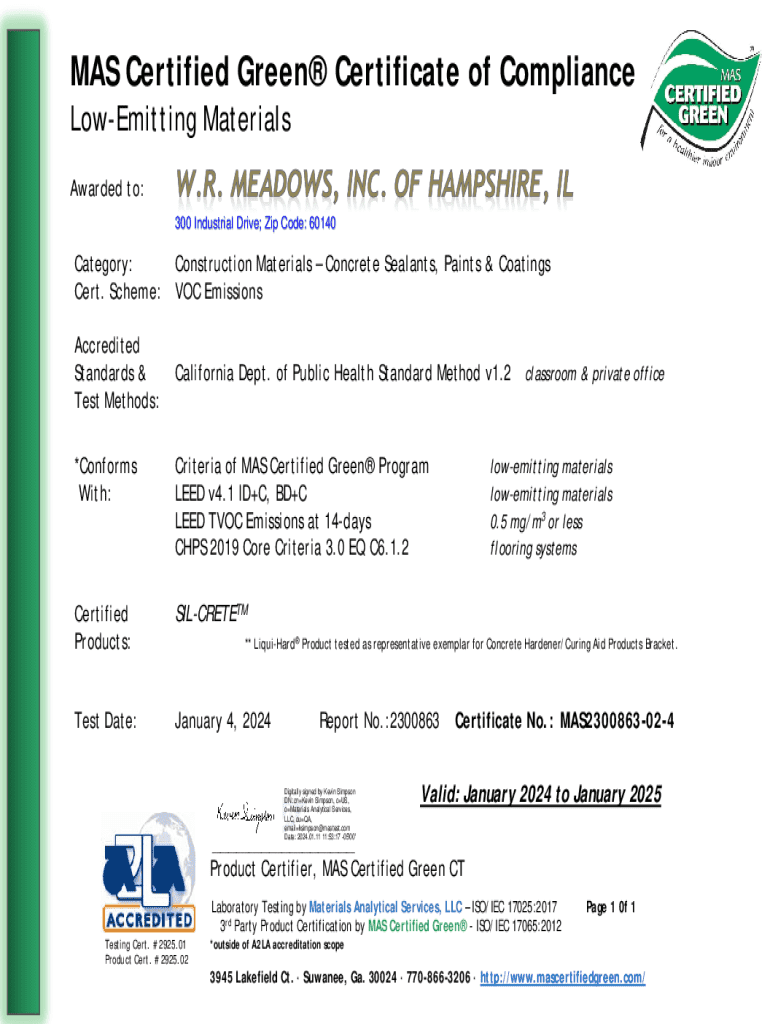 MAS Certified Green Certificate of Compliance