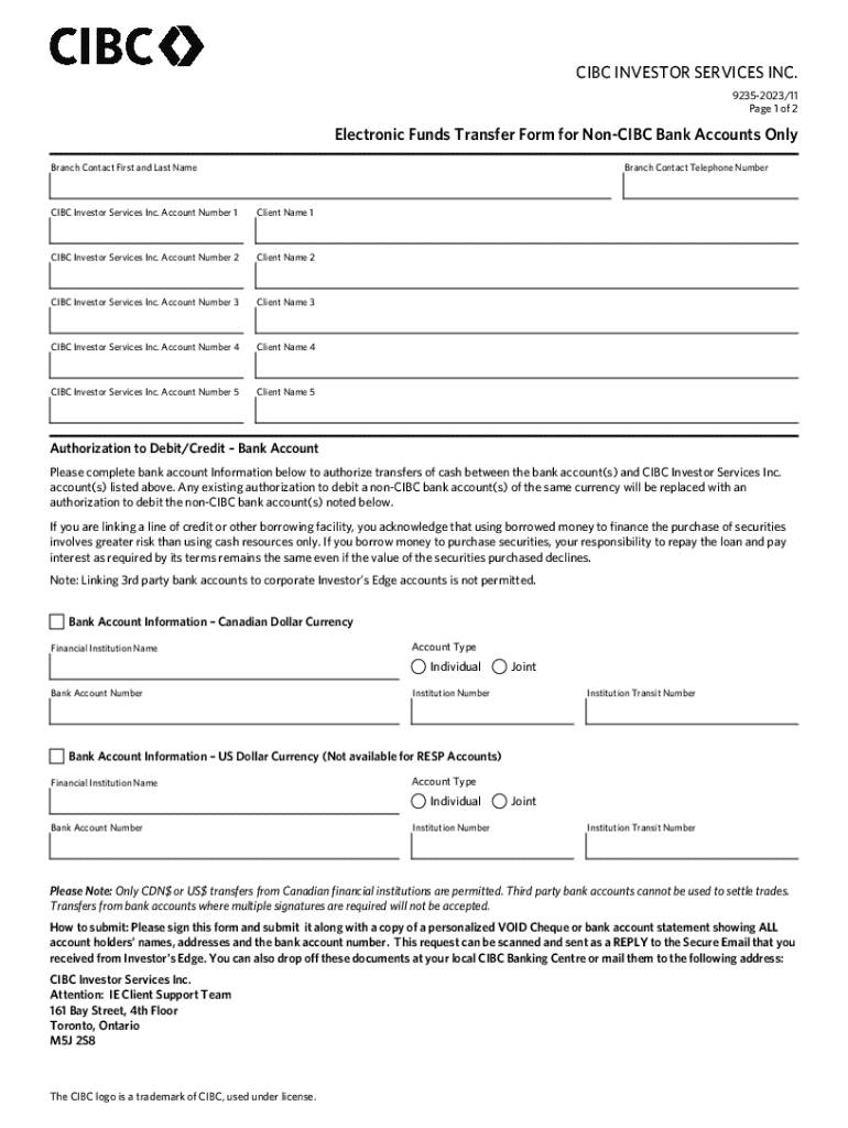 Get the free Electronic Funds Transfer Form for Non-CIBC Bank Accounts Only - CIBC Investor Servi...