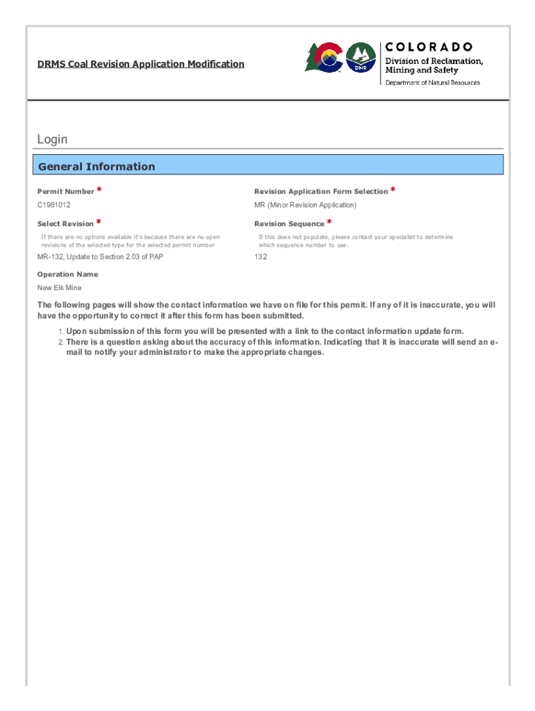 Permit Number *Revision Application Form Selection *C1981012MR (Minor Revision Application)Select Revision *Revision Sequence *If