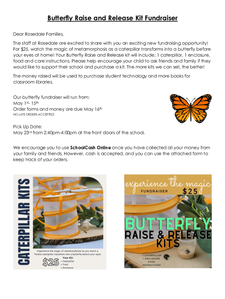 Butterfly Raise and Release Kit Fundraiser Dear Rosedale Families, The staff at Rosedale are excited to share with you an exciting new fundraising opportunity! For $25, watch the magic of metamorphosis