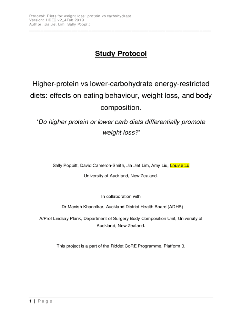 Protocol: Diets for weight loss: protein vs carbohydrate Version: HDEC v2_4Feb 2019 Author: Jia Jiet Lim_Sally Poppitt___Study ProtocolHigherprotein vs lowercarbohydrate energyrestricted diets: effects
