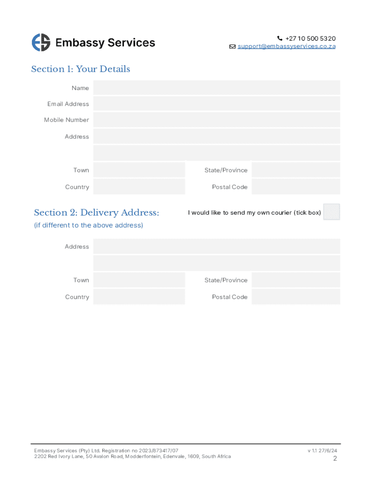 +27 10 500 5320 support@embassyservices.co.zaDIRCO Apostle Application Form Version 1.1 28/6/24Please Note: Embassy Services (Pty) Ltd is a private company and not a government department or High