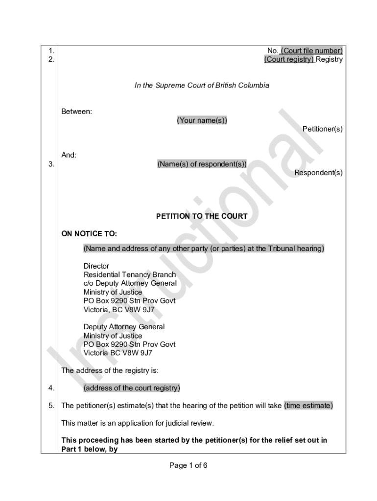 1. 2.No. (Court file number) (Court registry) Registry In the Supreme Court of British Columbia Between:3.And:(Your name(s))(Name(s) of respondent(s))Petitioner(s)Respondent(s)PETITION TO THE COURT
