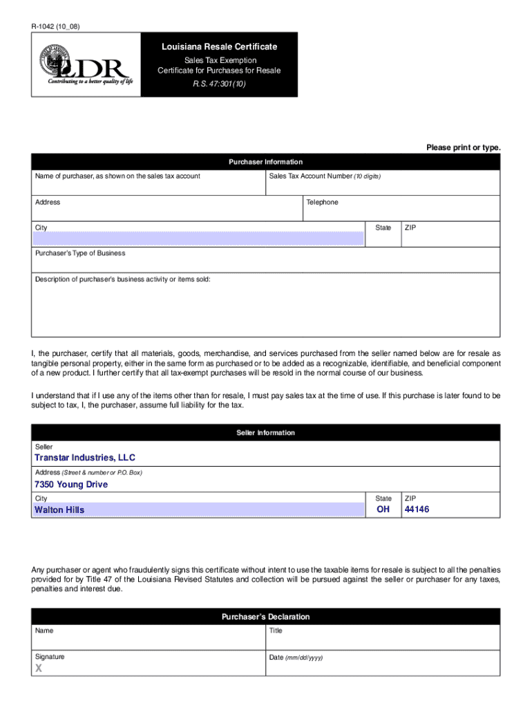 Get the free Louisiana Resale Certificate Transtar Industries, LLC 7350 ...