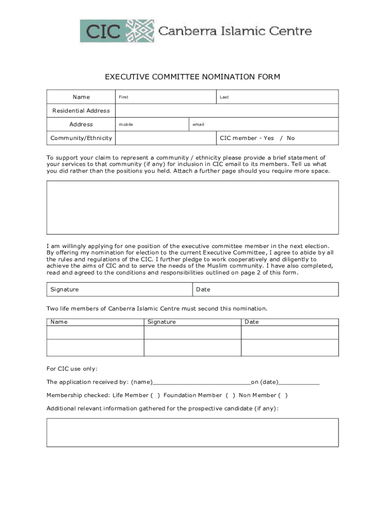 EXECUTIVE COMMITTEE NOMINATION FORM NameFirstLastResidential Address AddressmobileemailCommunity/EthnicityCIC member Yes/ NoTo support your claim to represent a community / ethnicity please provide