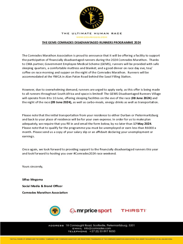 THE GEMS COMRADES DISADVANTAGED RUNNERS Program 2024The Comrades Marathon Association is proud to announce that it will be offering a facility to support the participation of financially disadvantaged