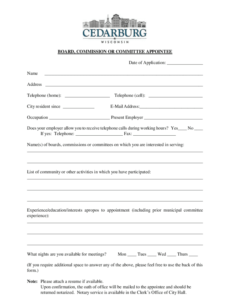 BOARD, COMMISSION OR COMMITTEE APPOINTEE Date of Application: ___ Name___Address ___ Telephone (home): ___ City resident since ___Telephone (cell): ___ EMail Address:___Occupation ___ Present Employer