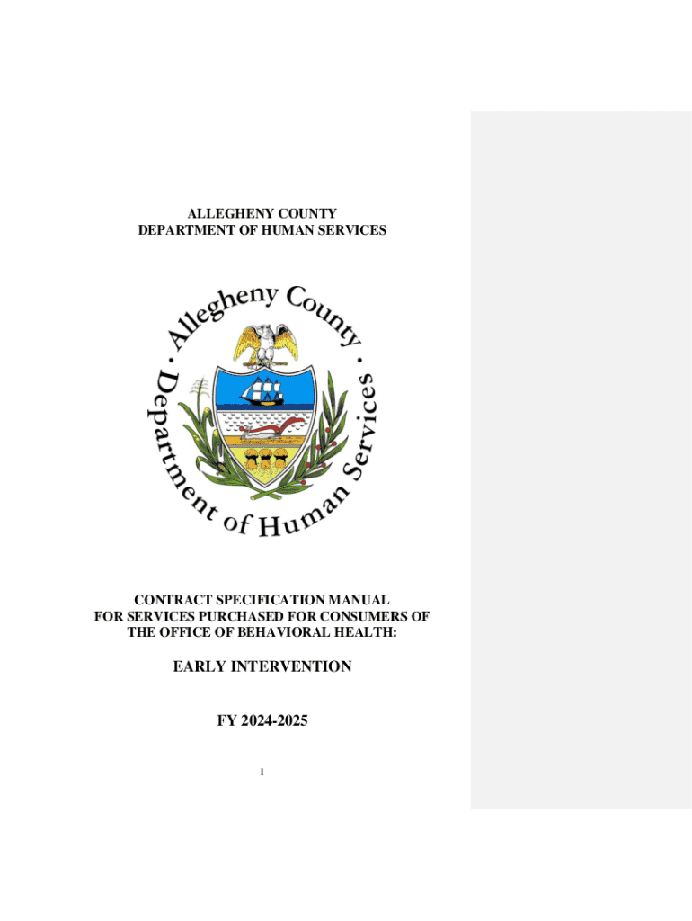 ALLEGHENY COUNTY DEPARTMENT OF HUMAN SERVICESCONTRACT SPECIFICATION MANUAL FOR SERVICES PURCHASED FOR CONSUMERS OF THE OFFICE OF BEHAVIORAL HEALTH:EARLY INTERVENTION FY 20242025 1TABLE OF CONTENTS