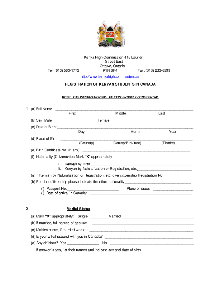 Registering Kenyan students in Canada form from Kenya High Commission in Ottawa, Ontario. Provide personal details, educational background, employment history, and contact information. Keep information confidential. Submit to Kenya High Commission in person or by email.
