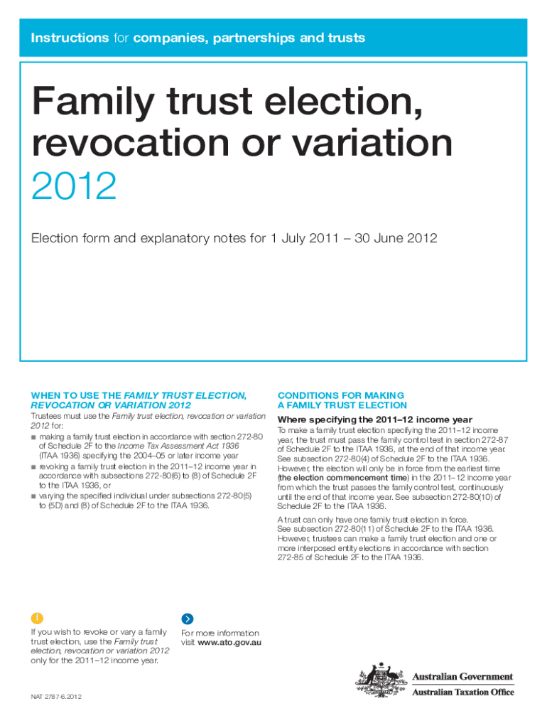 Instructions for companies, partnerships and trustsFamily trust election, revocation or variation 2012 Election form and explanatory notes for 1 July 2011 30 June 2012WHEN TO USE THE FAMILY TRUST