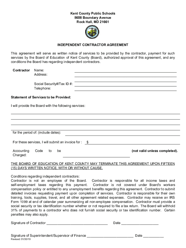 Kent County Public Schools 5608 Boundary Avenue Rock Hall, MD 21661INDEPENDENT CONTRACTOR AGREEMENT This agreement will serve as written notice of services to be provided by the contractor, payment