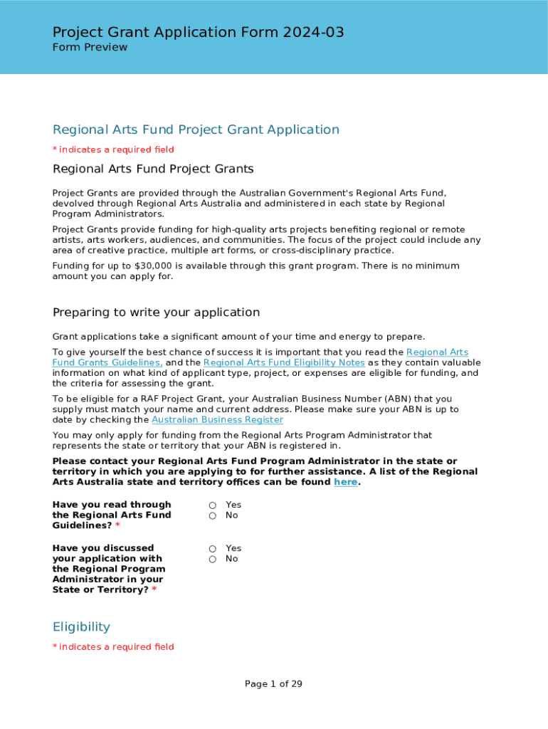 Project Grant Application Form 202403 Form PreviewRegional Arts Fund Project Grant Application * indicates a required regional Arts Fund Project Grants are provided through the Australian Government\'s