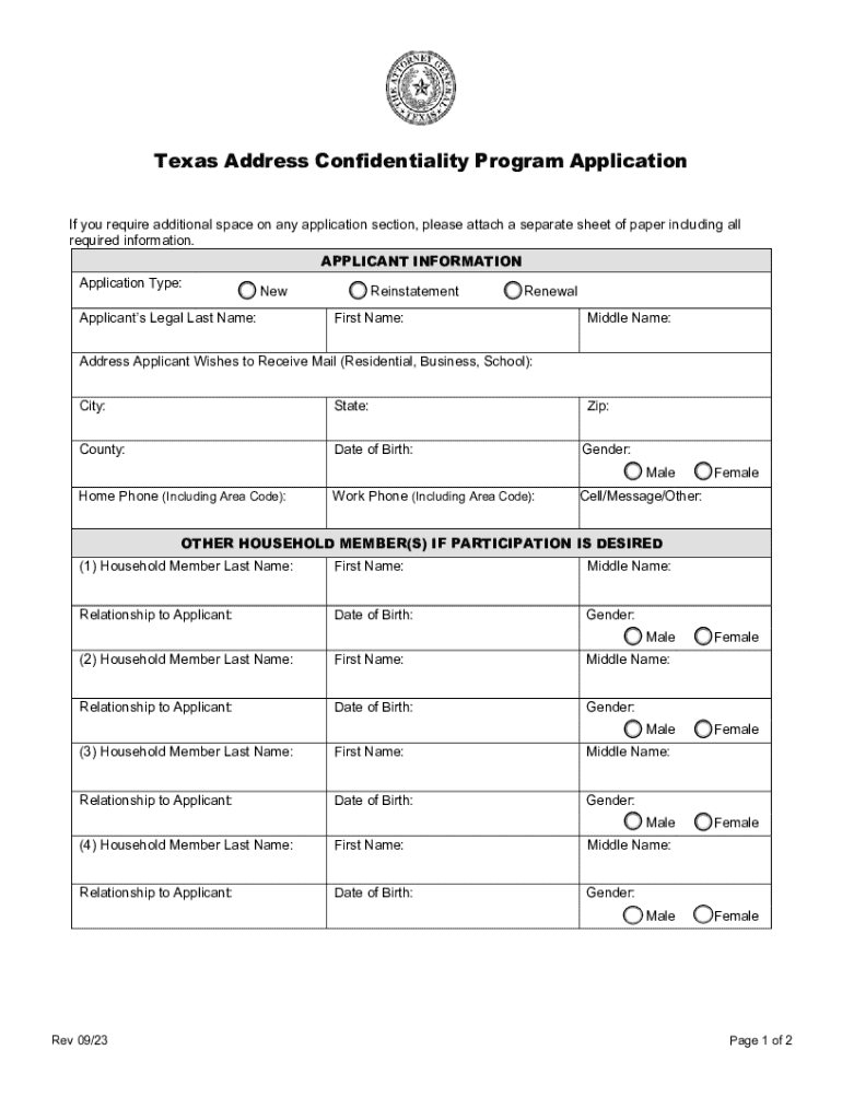 Texas Address Confidentiality Program Application If you require additional space on any application section, please attach a separate sheet of paper including all required information. APPLICANT