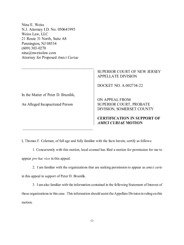 Get the free Nina E. Weiss N.J. Attorney I.D. No. 050641995 Weiss Law, LLC 21 ...