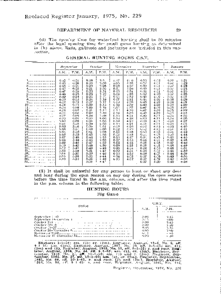 Replaced Register January 1975, No. 229 29DEPARTMENT OF NATURAL RESOURCES(d) The opening time for waterfowl hunting shall be 30 minutes after the legal opening time for small game hunting as determined