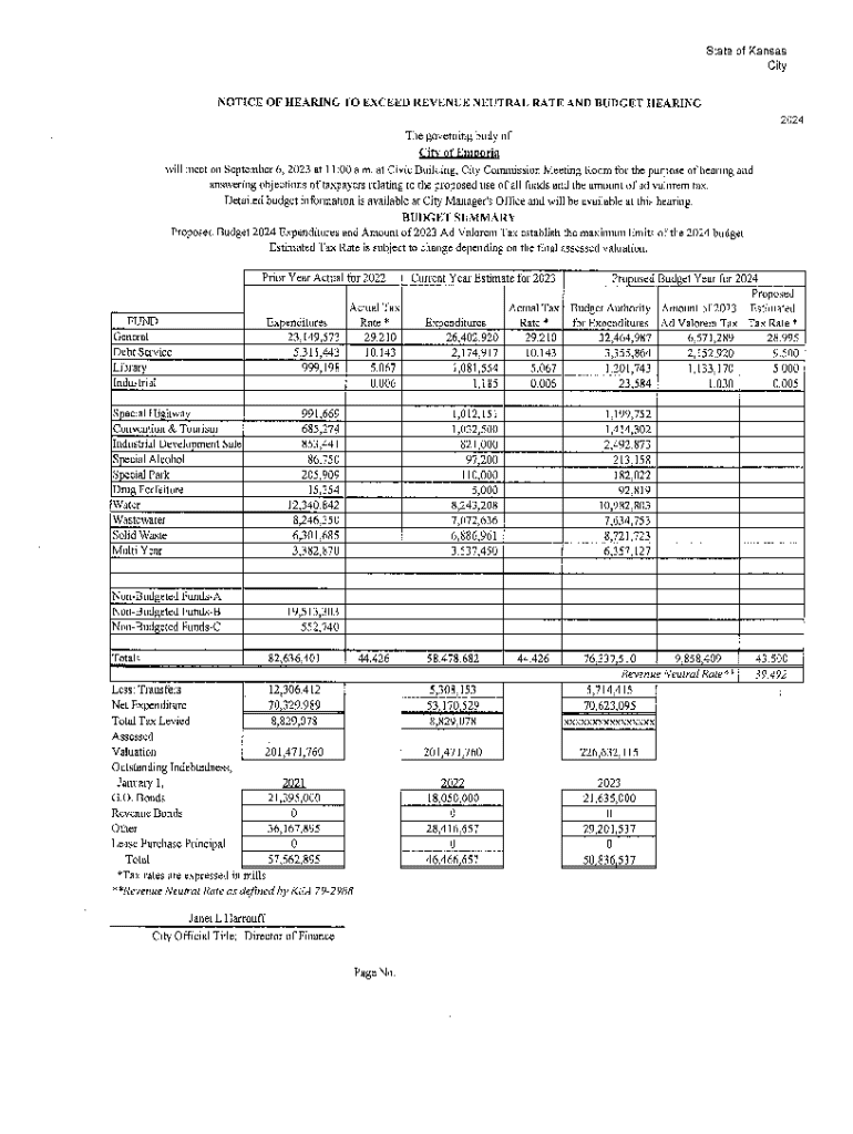 2024BUDGET YEAR ADD 3.0% FOR TOTAL BUDGET PREVIOUS TAX DELINQUENT TAX YEAR FUND REQUIREMENTS TAXES REQUIREMENT LEVY MILL LEVY DIFFERENCE ___ ___ ___ ___ ___ ___ ___ GENERAL$$6,379,892.00191,396.76$6,571,288.7628.99528.8000.196LIBRARY$$1,100,165.2033,004.96$1,133,170.165.$0004.9960.0051,000.00$$30.001,030.000.0050.0050.001INDUSTRIALBOND&INTEREST