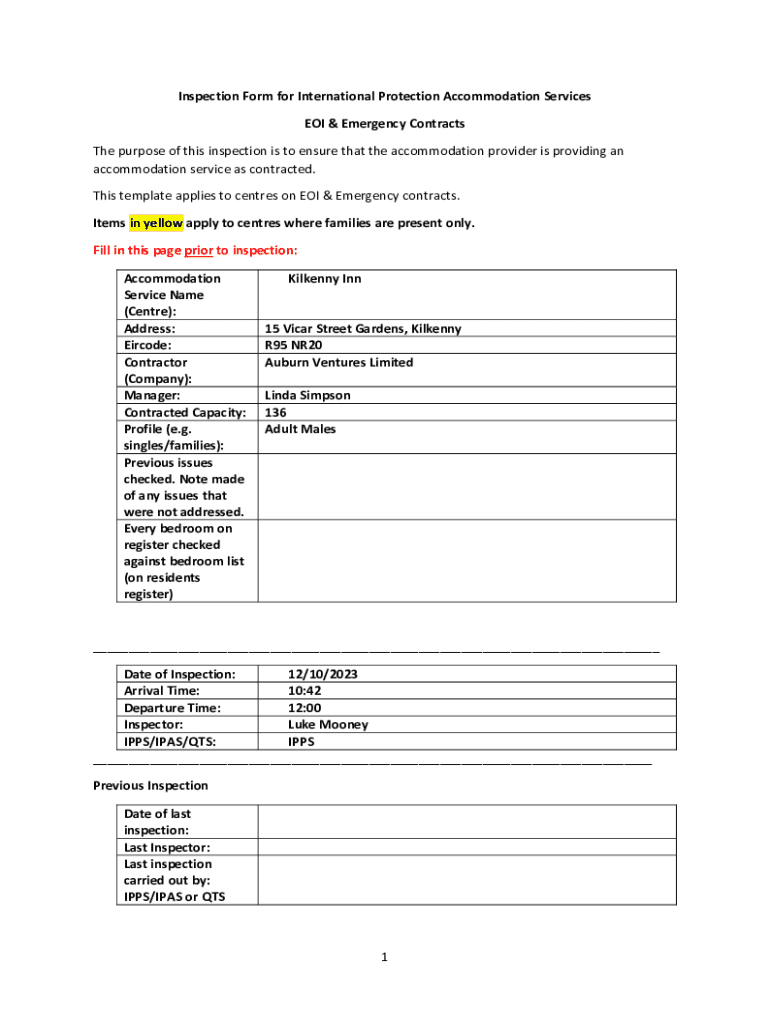 Inspection Form for International Protection Accommodation Services EOI & Emergency Contracts The purpose of this inspection is to ensure that the accommodation provider is providing an accommodation
