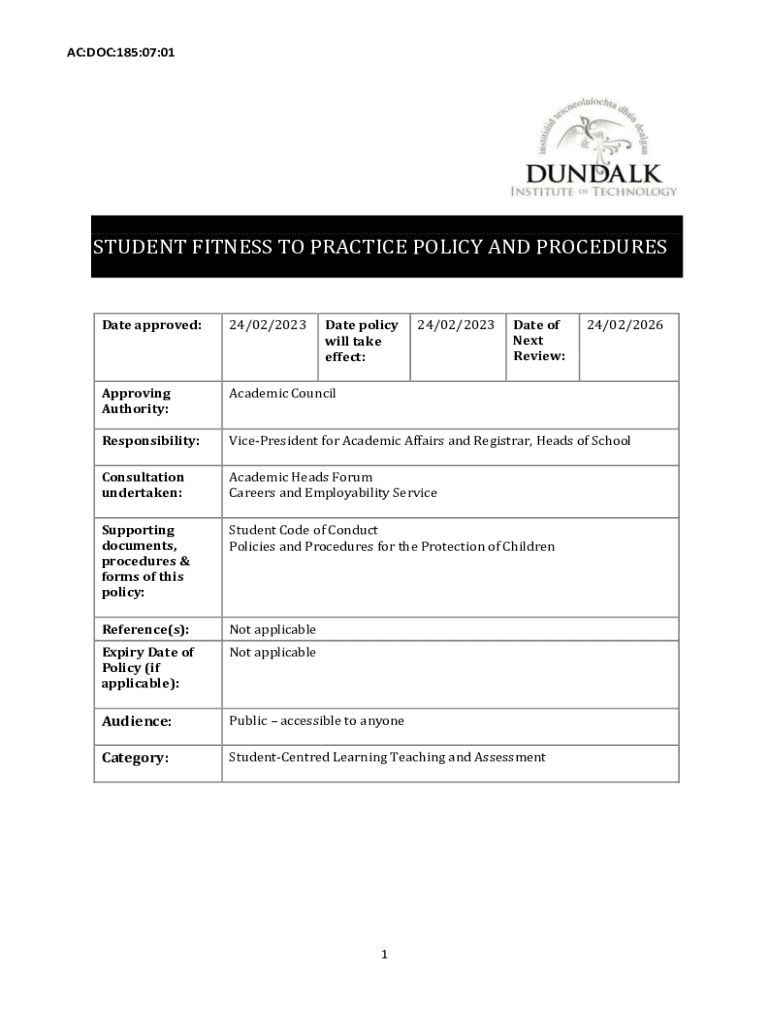 AC:DOC:185:07:01STUDENT FITNESS TO PRACTICE POLICY AND PROCEDURESDate policy will take effect:24/02/2023Approving Authority:Academic CouncilResponsibility:VicePresident for Academic Affairs and Registrar,