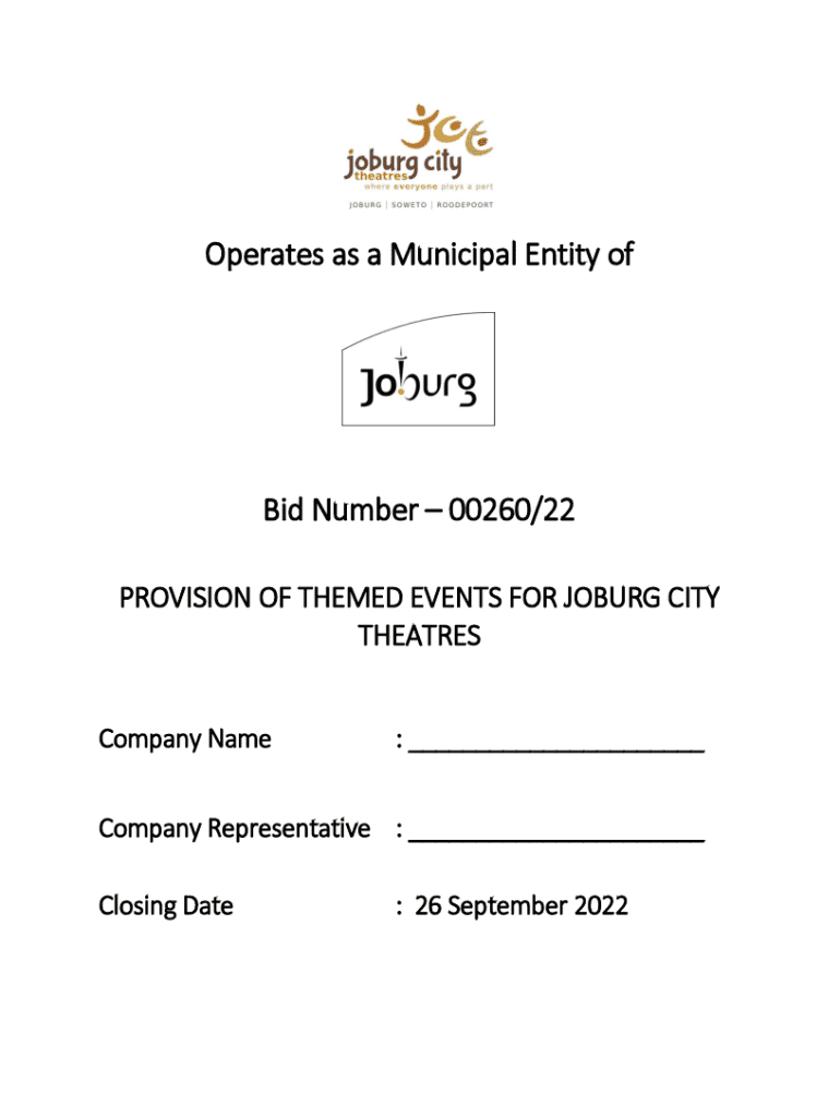 Operates as a Municipal Entity ofBid Number 00260/22 PROVISION OF THEMED EVENTS FOR JOBURG CITY THEATRES Company Name: ___Company Representative : ___ Closing Date: 26 September 2022BID No.00260/22