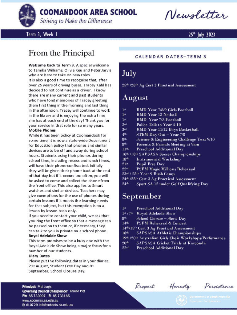 Term 3, Week 1From the Principal Welcome back to Term 3. A special welcome to Tamika Williams, Olivia Red and Peter Jarvis who are here to take on new roles. It is also a good time to recognize that,
