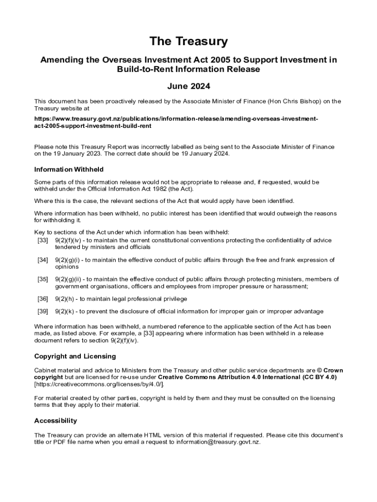 The Treasury Amending the Overseas Investment Act 2005 to Support Investment in BuildtoRent Information Release June 2024 This document has been proactively released by the Associate Minister of Finance