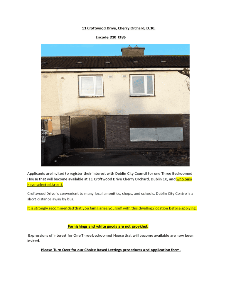 11 Croftwood Drive, Cherry Orchard, D.10. Eircode D10 T386Applicants are invited to register their interest with Dublin City Council for one Three Bedroomed House that will become available at 11