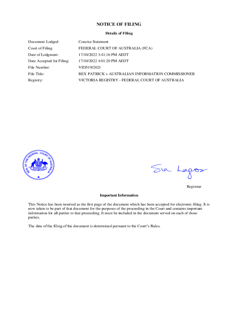 Document Lodged:Concise StatementCourt of FilingFEDERAL COURT OF AUSTRALIA (FCA)Date of Judgment:17/10/2022 3:41:16 PM Candidate Accepted for Filing:17/10/2022 4:01:20