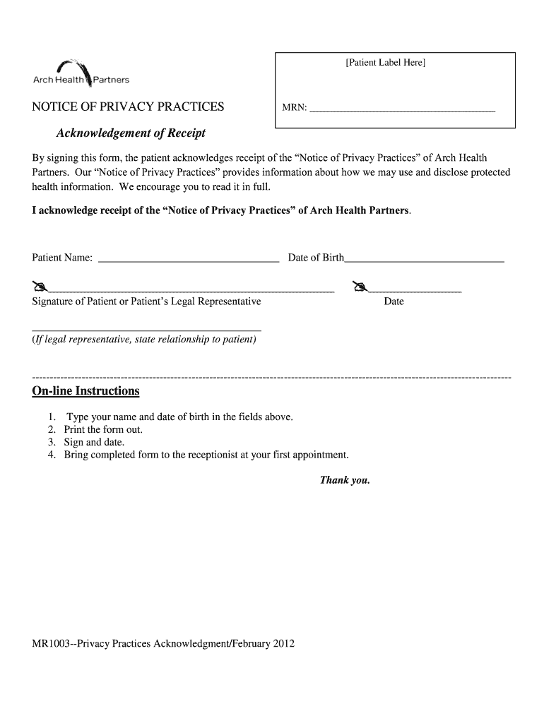 Patient Label Here NOTICE OF PRIVACY PRACTICES MAN: Acknowledgement of Receipt By signing this form, the patient acknowledges receipt of the Notice of Privacy Practices of Arch Health Partners. Our