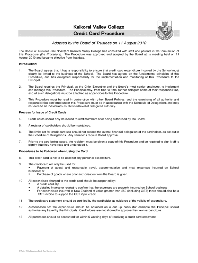 Nikolai Valley College Credit Card Procedure Adopted by the Board of Trustees on 11 August 2010 The Board of Trustees (the Board) of Nikolai Valley College has consulted with staff and parents in