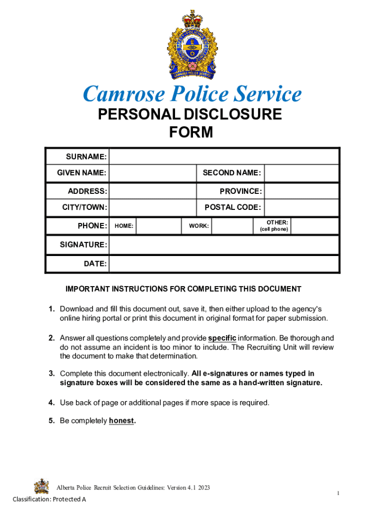 Camrose Police Service PERSONAL DISCLOSURE FORMSURNAME: GIVEN NAME:SECOND NAME:ADDRESS:PROVINCE:CITY/TOWN:POSTAL CODE:PHONE:HOME:WORK:OTHER:(cell phone)SIGNATURE: DATE: IMPORTANT INSTRUCTIONS FOR