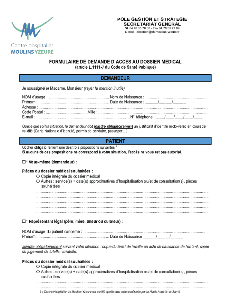 POLE GESTION ET STRATEGIE SECRETARIAT GENERAL 04 70 35 76 05 Fax 04 70 35 77 99 Email : direction@chmoulinsyzeure.frFORMULAIRE DE DEMANDE DACCES AU DOSSIER MEDICAL (article L.11117 du Code de Sant