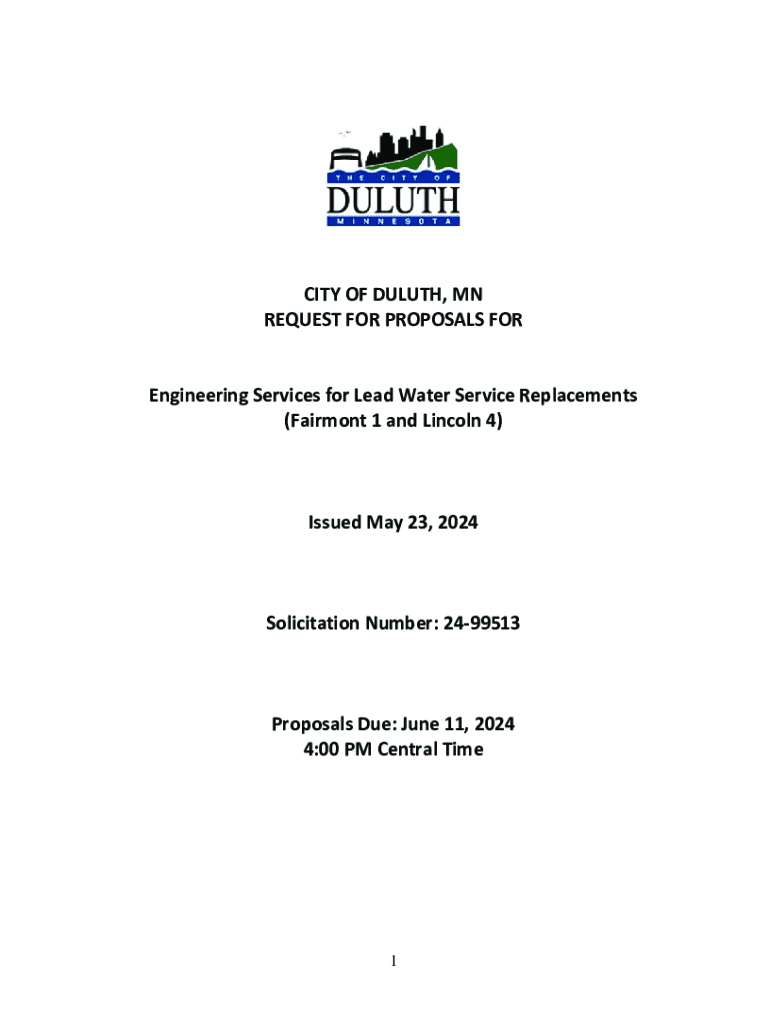 CITY OF DULUTH, MN REQUEST FOR PROPOSALS FOR Engineering Services for Lead Water Service Replacements (Fairmont 1 and Lincoln 4)Issued May 23, 2024Solicitation Number: 2499513Proposals Due: June 11,