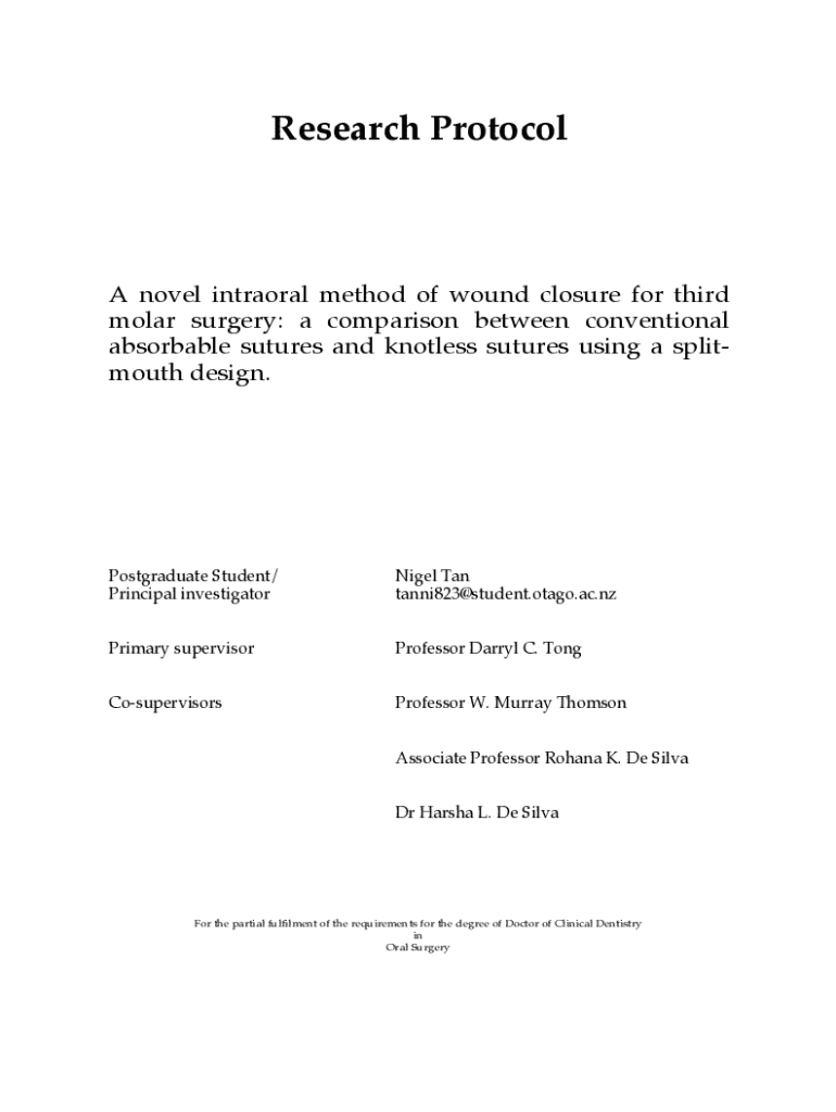 Research Protocol novel intramural method of wound closure for third molar surgery: a comparison between conventional absorbable sutures and knotless sutures using a split mouth design. Postgraduate
