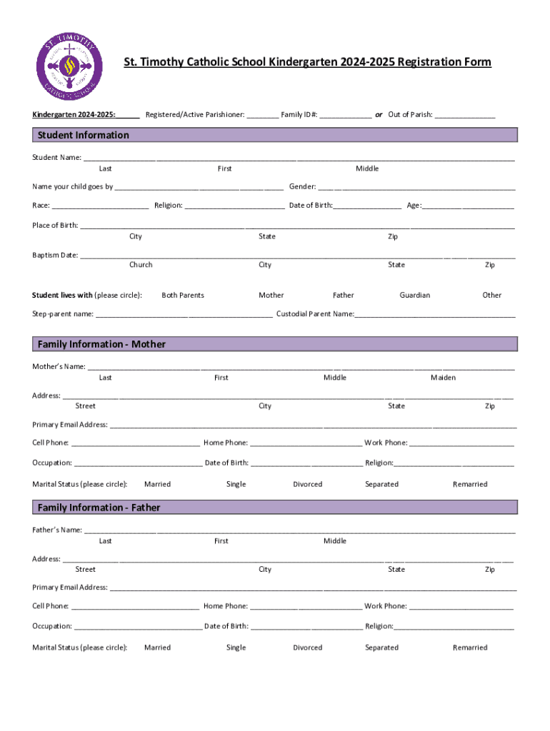 St. Timothy Catholic School Kindergarten 20242025 Registration Prekindergarten 20242025:___ Registered/Active Parishioner: ___ Family ID#: ___ or Out of Parish: ___Student Information