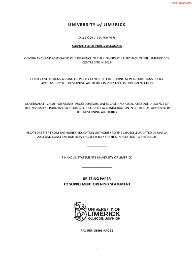 R2586 (iii) PAC33UNIVERSITY of LIMERICK ___OLLSCOIL LUINMIGH COMMITTEE OF PUBLIC ACCOUNTS GOVERNANCE AND ASSOCIATED DUE DILIGENCE OF THE UNIVERSITYS PURCHASE OF THE LIMERICK CITY CENTRE SITE IN 2019