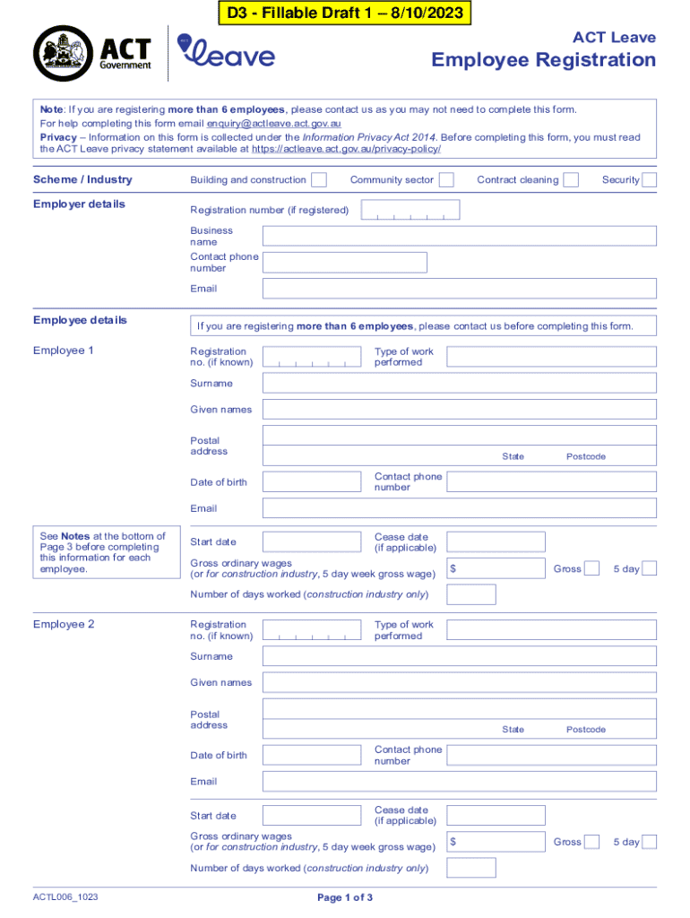 D3 Fillable Draft 1 8/10/2023ACT LeaveEmployee Registration Note: If you are registering more than 6 employees, please contact us as you may not need to complete this form. For help completing this