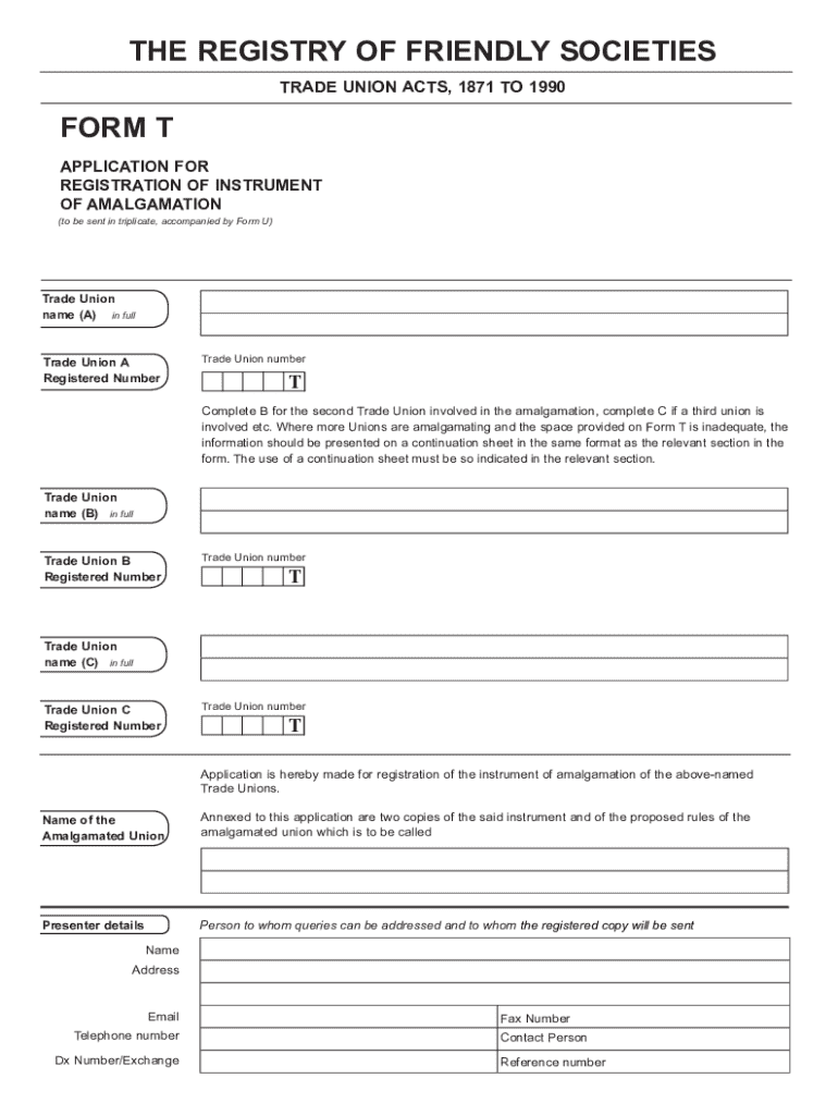 THE REGISTRY OF FRIENDLY SOCIETIES TRADE UNION ACTS, 1871 TO 1990FORM T APPLICATION FOR REGISTRATION OF INSTRUMENT OF AMALGAMATION(to be sent in triplicate, accompanied by Form U)Trade Union name