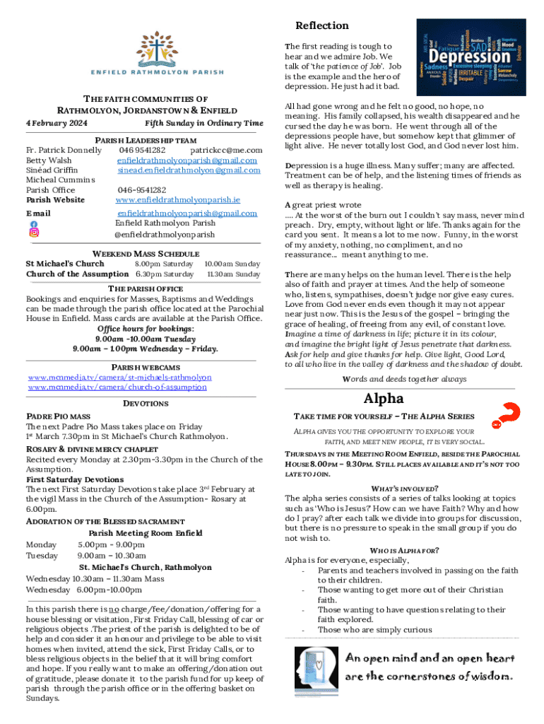 A reflection on the challenges faced in faith, the support provided by parish services, and the importance of community involvement. Explore topics like depression, faith, prayer, and pastoral care through the lens of Enfield Rathmolyon Parish life.