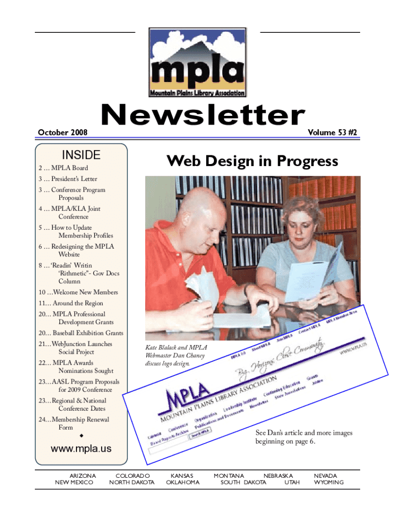 October 2008NewsletterINSIDEVolume 53 #2Web Design in Progress2 MPA Board3 Presidents Letter3 Conference Program Proposals 4 MPA/LA Joint Conference5 How to Update Membership Proles6 Redesigning the