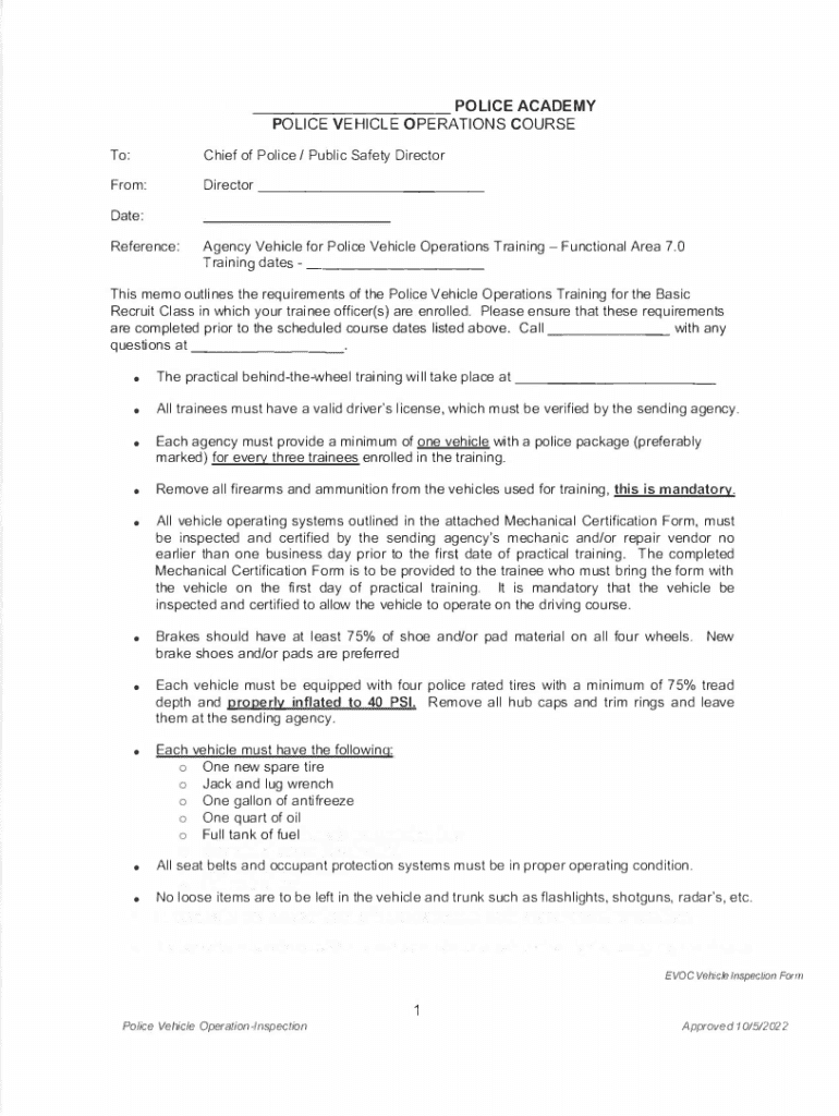 ___ POLICE ACADEMY POLICE VEHICLE OPERATIONS COURSE To:Chief of Police / Public Safety DirectorFrom:Director ___Date: Reference:Agency Vehicle for Police Vehicle Operations Training Functional Area