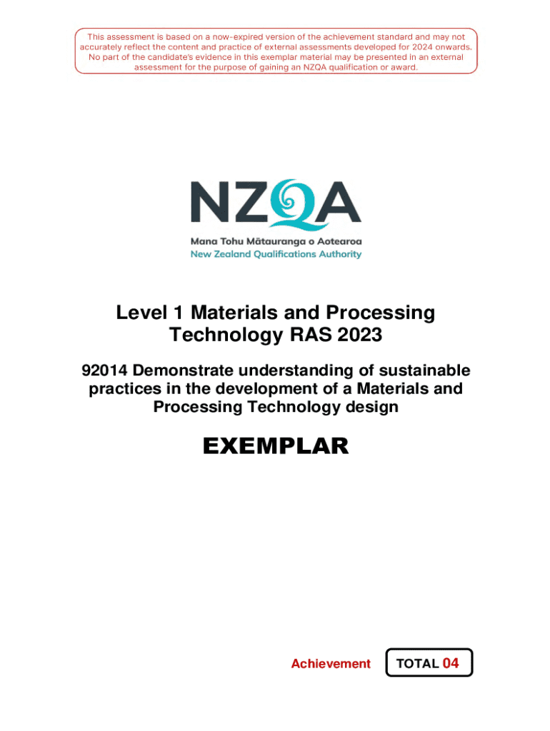 Level 1 Materials and Processing Technology RAS 2023 92014 Demonstrate understanding of sustainable practices in the development of a Materials and Processing Technology designEXEMPLARAchievementTOTAL