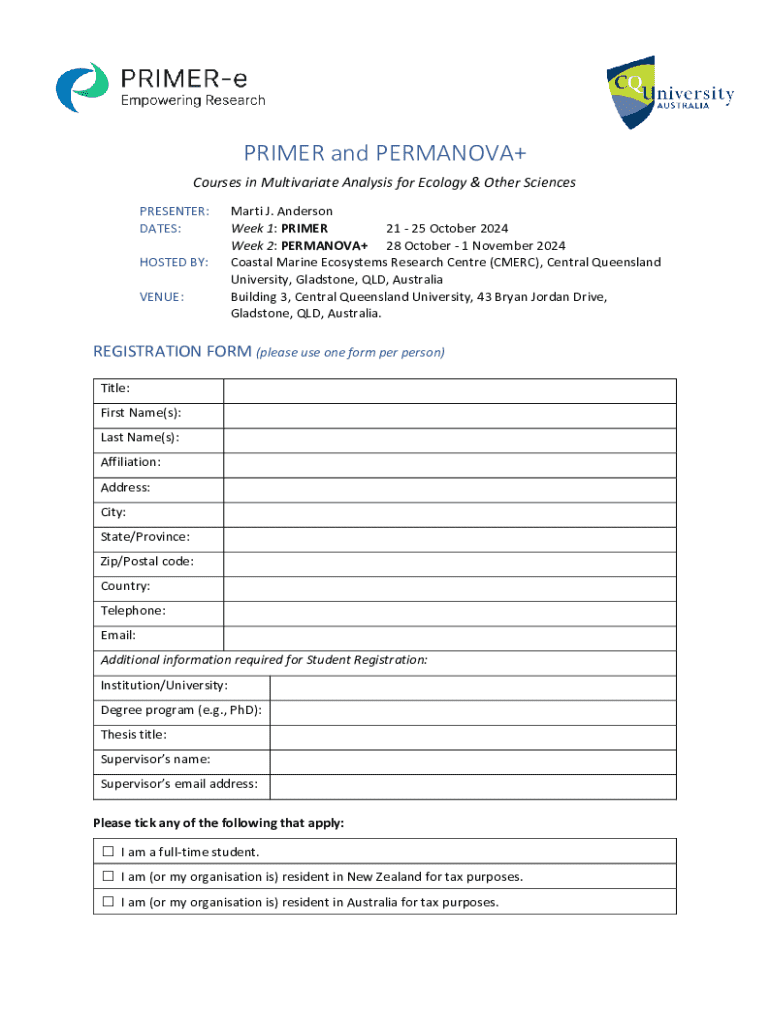 PRIMER and PERMANOVA+ Courses in Multivariate Analysis for Ecology & Other Sciences PRESENTER: DATES: HOSTED BY: VENUE:Marti J. Anderson Week 1: PRIMER 21 25 October 2024 Week 2: PERMANOVA+ 28 October