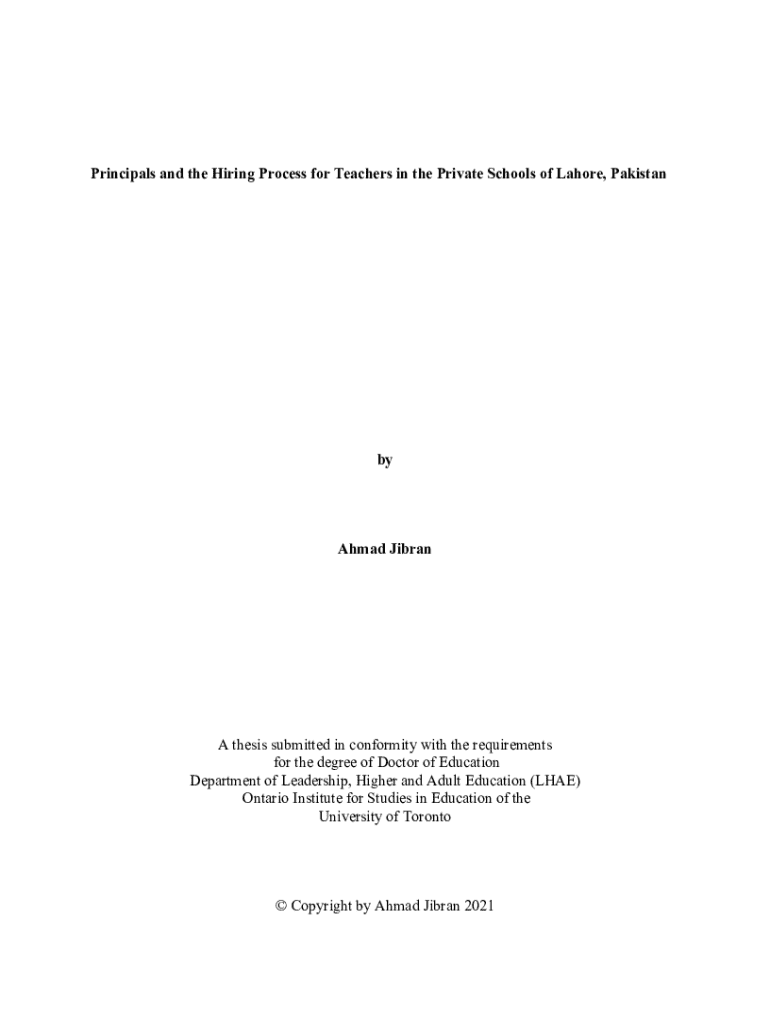 Principals and the Hiring Process for Teachers in the Private Schools of Lahore, PakistanbyAhmad Vibrant thesis submitted in conformity with the requirements for the degree of Doctor of Education