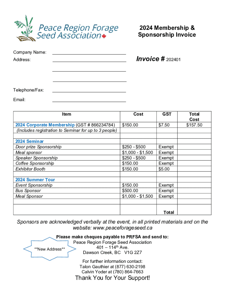 Official invoice for 2024 membership & sponsorship opportunities with Peace Region Forage Seed Association. Register for corporate membership, seminar sponsorships, summer tour sponsorships, and more. Contact us for further details.
