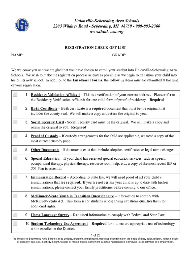 UnionvilleSebewaing Area Schools 2203 Wildner Road Sebewaing, MI 48759 9898832360 www.thinkusa.orgREGISTRATION CHECK OFF LIST NAME:___GRADE:___We welcome you and we are glad that you have chosen to