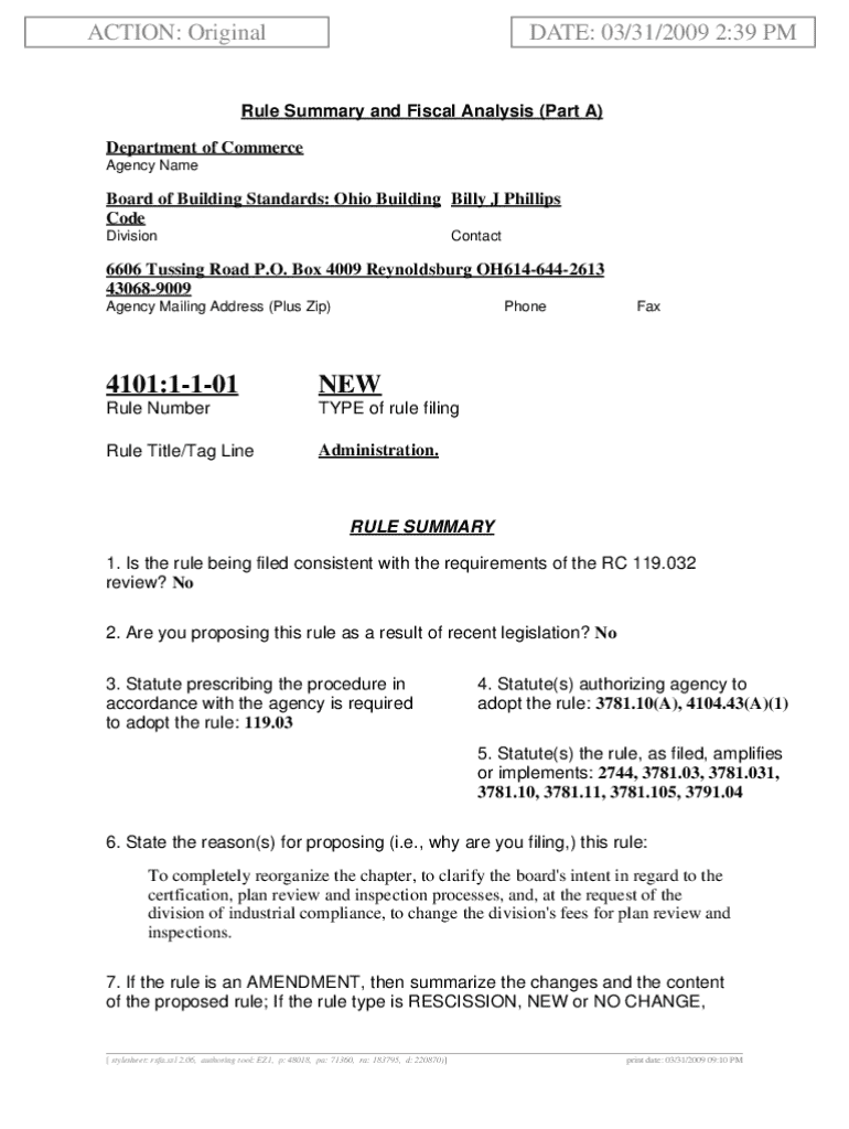 ACTION: Originate: 03/31/2009 2:39 Rule Summary and Fiscal Analysis (Part A) Department of Commerce Agency Baseboard of Building Standards: Ohio Building Billy J Phillips Code DivisionContact6606