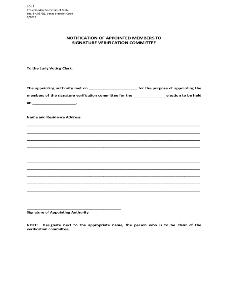 1013 Prescribed by Secretary of State Sec. 87.027(c), Texas Election Code 9/2023NOTIFICATION OF APPOINTED MEMBERS TO SIGNATURE VERIFICATION COMMITTEETo the Early Voting Clerk:The appointing authority