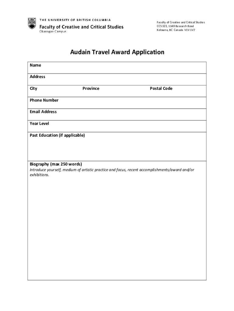 Faculty of Creative and Critical Studies CCS 323, 1148 Research Road Kelowna, BC Canada V1V 1V7Audain Travel Award Application Name Address CityProvincePostal Telephone Number Email Address Year Level