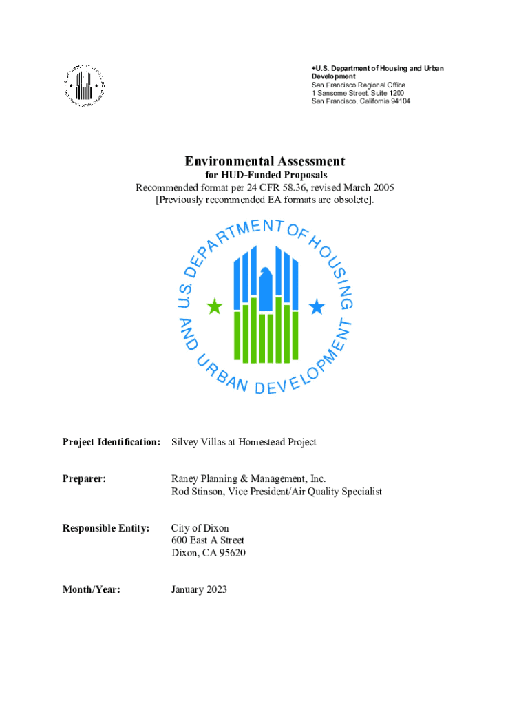 +U.S. Department of Housing and Urban Development San Francisco Regional Office 1 Sansome Street, Suite 1200 San Francisco, California 94104Environmental Assessmentfor HUDFunded Proposals Recommended